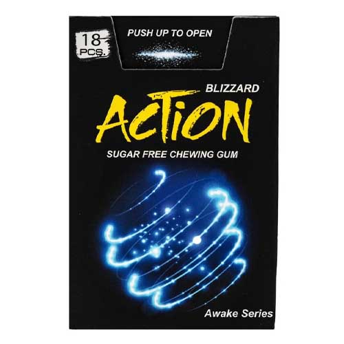 آدامس بدون شکر اکشن 18 عددی در دو طعم نعنا و اکالیپتوس خنک در بسته بندی پاکتی عرضه گردیده. آدامس های اکشن در طعم های بی نظیر و دارا بودن کافئین یک راه حل کوتاه، بیخطر و اثربخش برای مقابله با خوابآلودگیهای بی موقع میباشد.