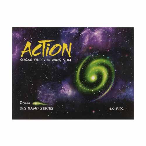 آدامس دراژه بدون شکر اکشن با دو طعم دراکو و بلک هول در بسته 10 عددی عرضه گردیده. طعم دراکو این محصول تلفیقی از سیب و نعنا و طعم بلک هول آن میکس ترش میباشد.