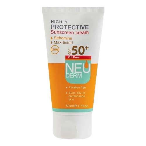 کرم ضد آفتاب Highly Protective نئودرم با SPF50 در سه مدل بی رنگ، رنگ طبیعی و تیره عرضه گردیده. این محصول حاوی فیلترهای قوی بوده و از پوست در برابر اشعههای UVB و UVA محافظت، و از بروز آسیبهای پوستی مانند لک و چین و چروک جلوگیری و مانع پیری زودرس پوست میگردد.
