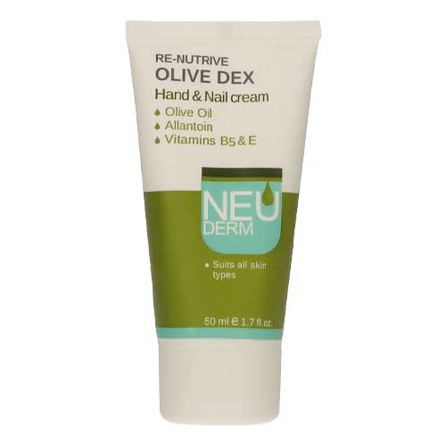 کرم دست و ناخن زیتون نئودرم به دو شکل تیوپی و کاسهای، حاوی عصاره زیتون، گلیسیرین و ویتامینها است و رطوبت را به پوست دست باز میگرداند. از خشکی و شکنندگی ناخنها جلوگیری و باعث استحکام ناخنها میشود.