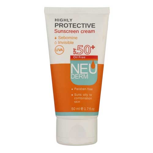 کرم ضد آفتاب Highly Protective نئودرم با SPF50 در سه مدل بی رنگ، رنگ طبیعی و تیره عرضه گردیده. این محصول حاوی فیلترهای قوی بوده و از پوست در برابر اشعههای UVB و UVA محافظت، و از بروز آسیبهای پوستی مانند لک و چین و چروک جلوگیری و مانع پیری زودرس پوست میگردد.