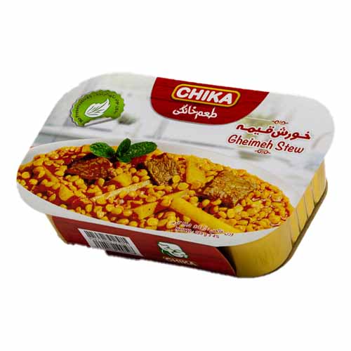 خورشت قیمه آماده چیکا از گوشت گوساله، لپه، سیب زمینی، رب گوجه فرنگی، پیاز، روغن مایع، آبلیمو، نمک، ادویه مخصوص، لیمو عمانی، زعفران و بدون مواد نگهدارنده درست شده است. پس از باز نمودن محصول، در یخچال نگهداری و تا 24 ساعت مصرف گردد.