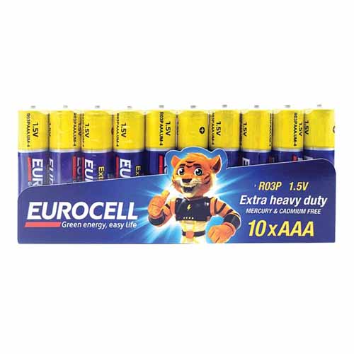 باتری نیم قلمی EUROCELL مدل کربن زینک شیرینک با سایز AAA در سه بسته بندی عرضه گردیده. این محصول با قدرت تخلیه بالا و طول عمر و ماندگاری بیشتر از باتری های باکیفیت موجود در بازار میباشد.