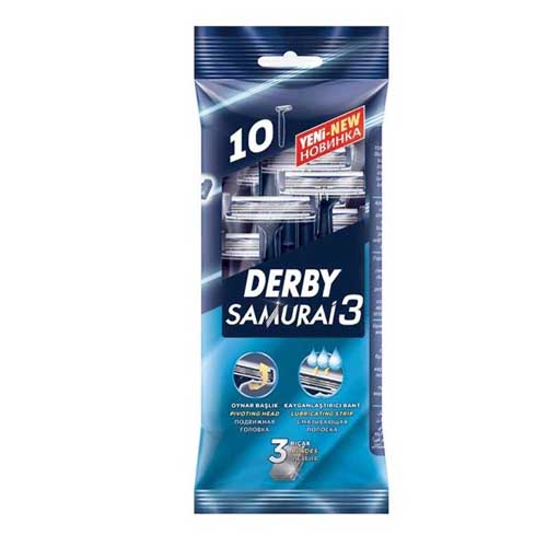 خودتراش سه لبه سامورایی 3 دربی دارای تیغه از جنس کروم و پلاتینیوم است. دارای نوار لغزنده حاوی ویتامین E است که از اصطکاک و سوختگی پوست جلوگیری میکند. دارای سری متحرک جهت حرکت آسان بر روی پوست میشود.