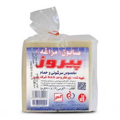 صابون مراغه پیروز مخصوص شستشوی سر و بدن در حمام میباشد. فاقد اسانس و حاوی گلیسیرین و روغن نارگیل است که پوست را تمیز، نرم و مرطوب میکند. این محصول دارای قالبهای 200 گرمی و بستهبندی 4 عددی است.