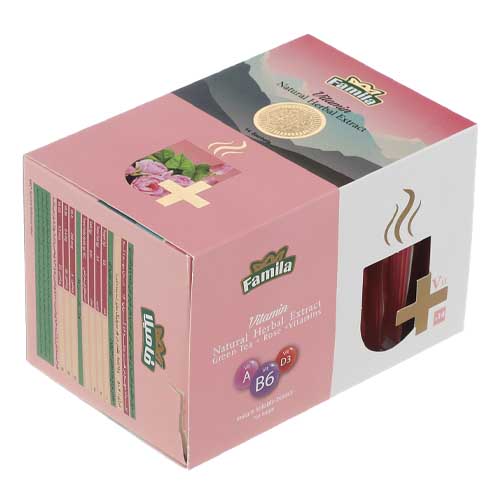 دمنوش چای سبز فامیلا در طعمهای متنوع در بسته بندی 14 عددی عرضه گردیده. این دمنوشها ترکیبی از عصاره چای سبز، فاقد قند و دارای شیرین کننده استویا و غنیشده با ویتامینهای D ،A و B6 میباشد.