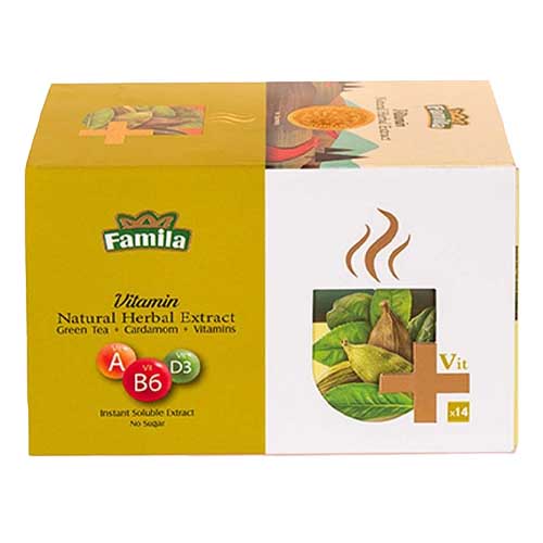 دمنوش چای سبز فامیلا در طعمهای متنوع در بسته بندی 14 عددی عرضه گردیده. این دمنوشها ترکیبی از عصاره چای سبز، فاقد قند و دارای شیرین کننده استویا و غنیشده با ویتامینهای D ،A و B6 میباشد.