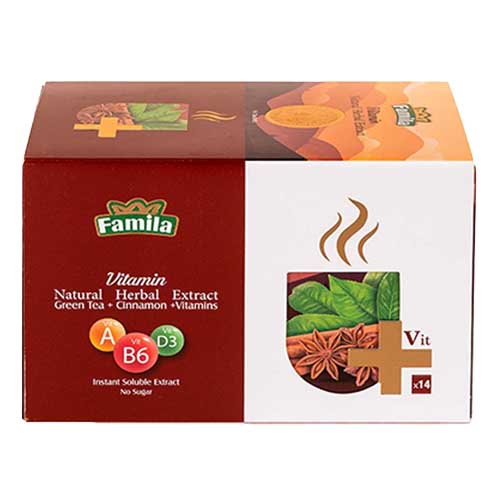 دمنوش چای سبز فامیلا در طعمهای متنوع در بسته بندی 14 عددی عرضه گردیده. این دمنوشها ترکیبی از عصاره چای سبز، فاقد قند و دارای شیرین کننده استویا و غنیشده با ویتامینهای D ،A و B6 میباشد.