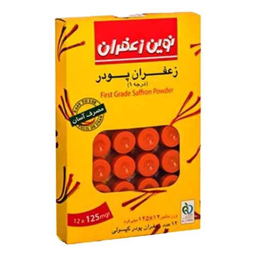 زعفران کپسولی نوین در دو نوع ساده و طرح شاهنامه دارای 12 عدد پودر زعفران خالص کپسولی ۱۲۵ میلی گرمی میباشد. میتوایند هر کدام از کپسول ها را در نوشیدنی یا غذا اضافه کنید و از عطر و طعم آن لذت ببرید.