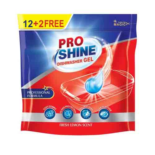 ژل ماشین ظرفشویی پروشاین مدل پروفشنال فرمولا در بسته های 420 میلی لیتری و 1 لیتری چربی زدای و از بین برنده بوی نامطبوع ظروف میباشد. این محصول به ظروف آسیبی نزده و حاوی رایحه لیمو میباشد.