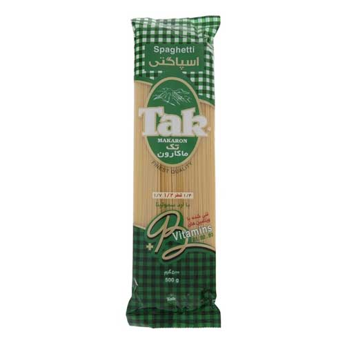 اسپاگتی 500 گرم تک ماکارون از آرد سمولینا و در قطرهای 1، 1.2، 1.4 و 1.5 تهیه شده است. این محصول با آخرین تکنولوژی روز دنیا تولید و بستهبندی میشود و غنی شده با ویتامینهای B1، B2 و B3 میباشد.