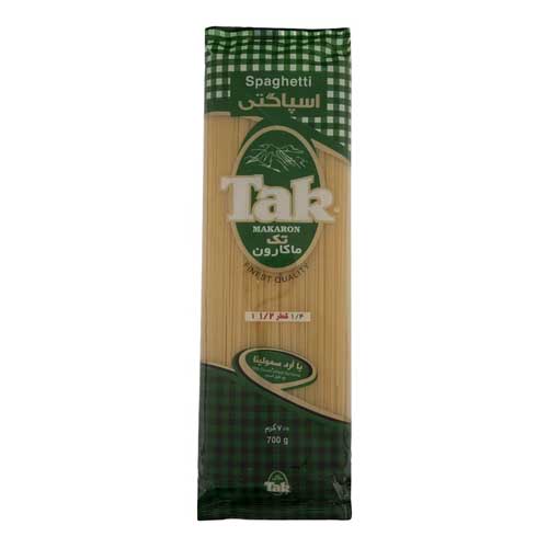 اسپاگتی 700 گرم تک ماکارون از آرد سمولینا و در قطرهای 1.2، 1.4، 1.5 و 1.7 تهیه شده است. این محصول با آخرین تکنولوژی روز دنیا تولید و بستهبندی میشود و غنی شده با ویتامینهای B1، B2 و B3 میباشد.