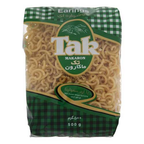 ماکارونی شکل دار تک ماکارون با وزن 500 گرم، از آرد سمولینا و یا استفاده از دستگاههای تمام اتوماتیک و پیشرفته و در طرحهای متنوع تولید میشود. دارای ارزش غذایی بالا، دستور پخت آسان و سرشار از فیبر و کربوهیدارات است.