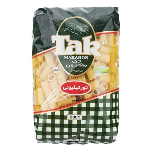 ماکارونی شکل دار تک ماکارون با وزن 500 گرم، از آرد سمولینا و با استفاده از دستگاههای تمام اتوماتیک و پیشرفته و در طرحهای متنوع تولید میشود. دارای ارزش غذایی بالا، دستور پخت آسان و سرشار از فیبر و کربوهیدارات است.