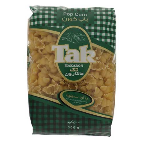ماکارونی شکل دار تک ماکارون با وزن 500 گرم، از آرد سمولینا و با استفاده از دستگاههای تمام اتوماتیک و پیشرفته و در طرحهای متنوع تولید و بسته بندی میشود. دارای ارزش غذایی بالا، دستور پخت آسان و سرشار از فیبر و کربوهیدارات است.