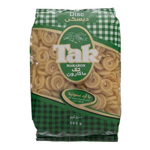 ماکارونی شکل دار تک ماکارون با وزن 500 گرم، از آرد سمولینا و با استفاده از دستگاههای تمام اتوماتیک و پیشرفته و در طرحهای متنوع تولید و بسته بندی میشود. دارای ارزش غذایی بالا، دستور پخت آسان و سرشار از فیبر و کربوهیدارات است.
