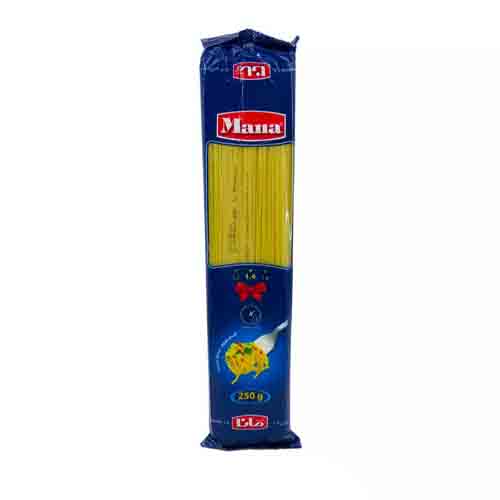 اسپاگتی مانا با قطر 1.4 در وزن های 250 گرم، 400 گرم، 500 گرم، 700 گرم و 1 کیلوگرم رشته ای و از گندم تولید شده است. این محصول ۳۰×۲×۱۰ سانتیمتر بوده و حاوی پروتئین و آهن میباشد.