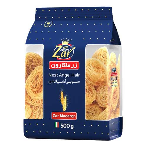 رشته سوپی زر ماکارون با فرم آشیانه ای از آرد سمولینا تولید و در سه وزن 200، 300 و 500 گرم عرضه گردیده. این ورمیشل آشیانهای حاوی فیبر و کربو هیدرات بوده و باعث جذب بهتر پروتئین میشود و مناسب برای درست کردن سوپ میباشد.