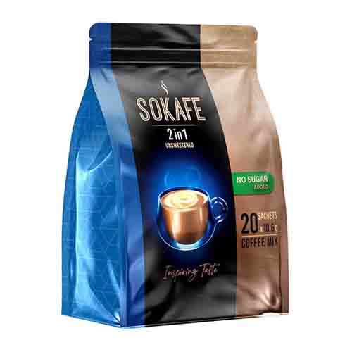 پودر قهوه 2 در 1 سوکافه در دو بسته 5 ساشه ای و 20 ساشه ای از مرغوبترین دانههای قهوه عربیکا به همراه پودر خامهایکننده تهیه شده و وزن هر ساشه 10.6 گرم میباشد.