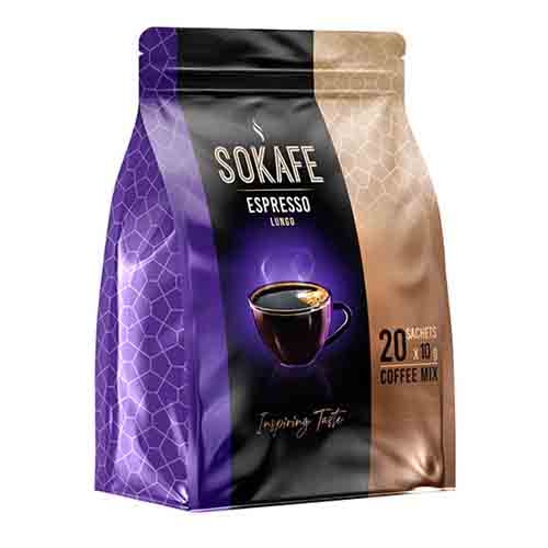 پودر قهوه فوری اسپرسو سوکافه در دو بسته 5 ساشه ای و 20 ساشه ای فاقد اسید های چرب ترانس میباشد. هر ساشه این محصول 10 گرم بوده و دارای میزان کافئین بیشتری در بین باقی نوشیدنیهای بر پایه قهوه میباشد.