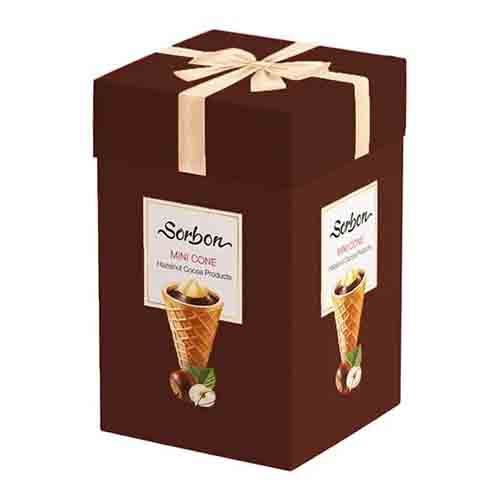 شکلات پذیرایی مخروطی با فرآورده کاکائویی و فندق سوربن مدل مینی کن در بسته 200 گرمی و 20 عددی با طعم فندق در سه رنگ قهوه ای، قرمز و فیروزه ای دارای ابعاد ۱۰ × ۱۰ × ۱۶.۵ سانتیمتر میباشد.