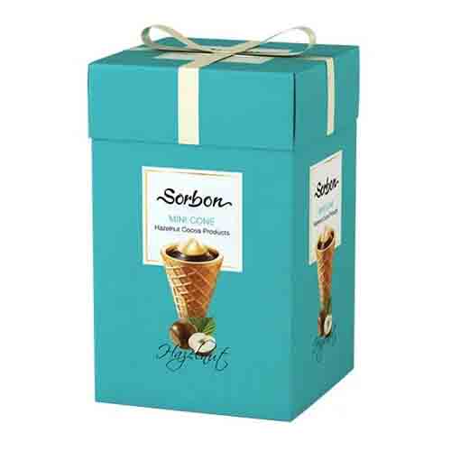 شکلات پذیرایی مخروطی با فرآورده کاکائویی و فندق سوربن مدل مینی کن در بسته 200 گرمی و 20 عددی با طعم فندق در سه رنگ قهوه ای، قرمز و فیروزه ای دارای ابعاد ۱۰ × ۱۰ × ۱۶.۵ سانتیمتر میباشد.