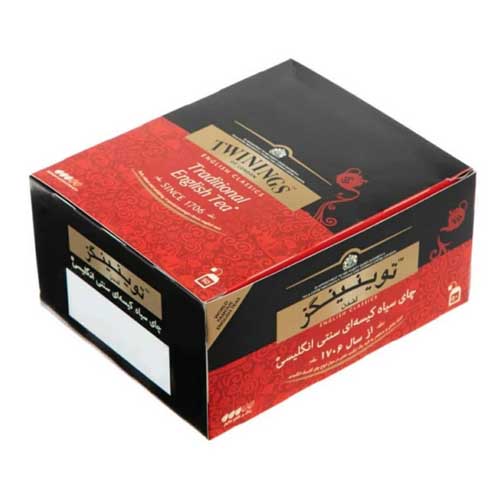 چای سیاه کیسه ای سنتی انگلیسی توینینگز در بستههای 25، 50 و 100 عددی، دارای عطر طبیعی و طعم منحصر به فردی بوده و ترکیبی از چای مرغوب سیلان و هندوستان است و سالهاست که نوشیدنی محبوب مردم انگلیس میباشد.