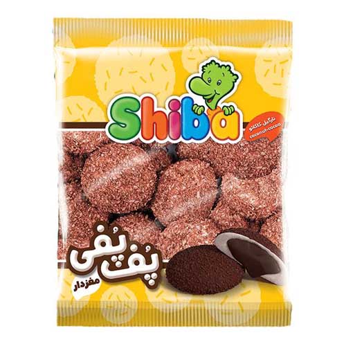 مارشمالو پف پفی مغزدار کاکائویی شیبا با پوشش نارگیلی دارای دو وزن 50 گرم و 70 گرم بوده و بافتی نرم و اسفنجی دارد. این محصول مغزی کاکائویی با طعم بسیار دلپذیر داشته و خیلی سریع در دهان ذوب میشود.