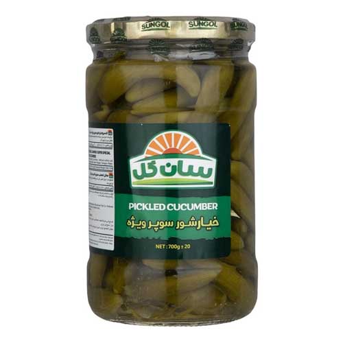 خیار شور سان گل شیشه ای 700 گرم ممتاز سوپر ویژه سرکه ای شور و ترشیجات خیارشور قیمت و خرید محصولات برند سان گل