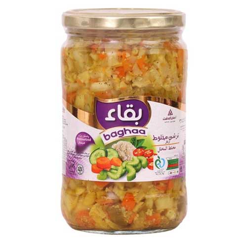 ترشی مخلوط بقاء دو مدل درشت و ریز با استفاده از بهترین مواد اولیه تهیه شده است. ترکیبات آن شامل گل کلم، کرفس، خیار، هویج، سیر، فلفل، نمک، ادویه و آب بوده و دارای طعم عالی و اصیل میباشد