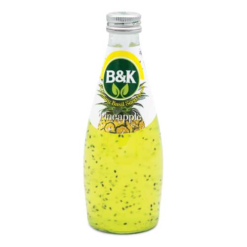 نوشیدنی حاوی بذر ریحان بی اند کی دارای بستهبندی شیشهای و وزن 300 میلی لیتر است. دارای طعمهای متنوع انار، آناناس، انبه، انگور قرمز و بلوبری و سرشار از ویتامین C بوده و باعث افزایش سوخت و ساز بدن و تقویت سیستم ایمنی میشود.