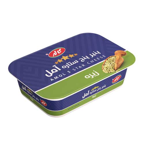 پنیر زیره پنج ستاره آمل کاله در سه وزن 100، 200 و 350 گرم نوعی پنیر پروسس و ترکیبی از پنیر تازه، پودر پنیر گودا، کره و زیره میباشد. این محصول طعمی لذیذ و خامه ای با عطر و طعم خوشایند زیره داشته و دارای بافتی نرم میباشد.