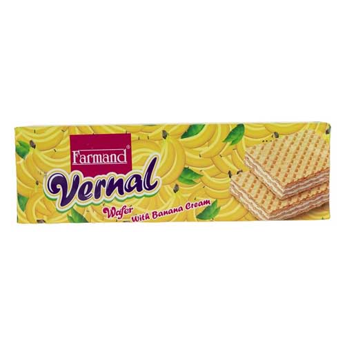 ویفر متوسط ورنال فرمند با وزن 80 گرم و بستهبندی سلفونی، دارای طعمهای کرمی توت فرنگی، موز، پرتقال و کاکائویی میباشد. دارای بافت سبک، ترد و خوشمزه ای بوده و برای میانوعده، خوراکی مدرسه کودکان و... مورد استفاده قرار میگیرد.
